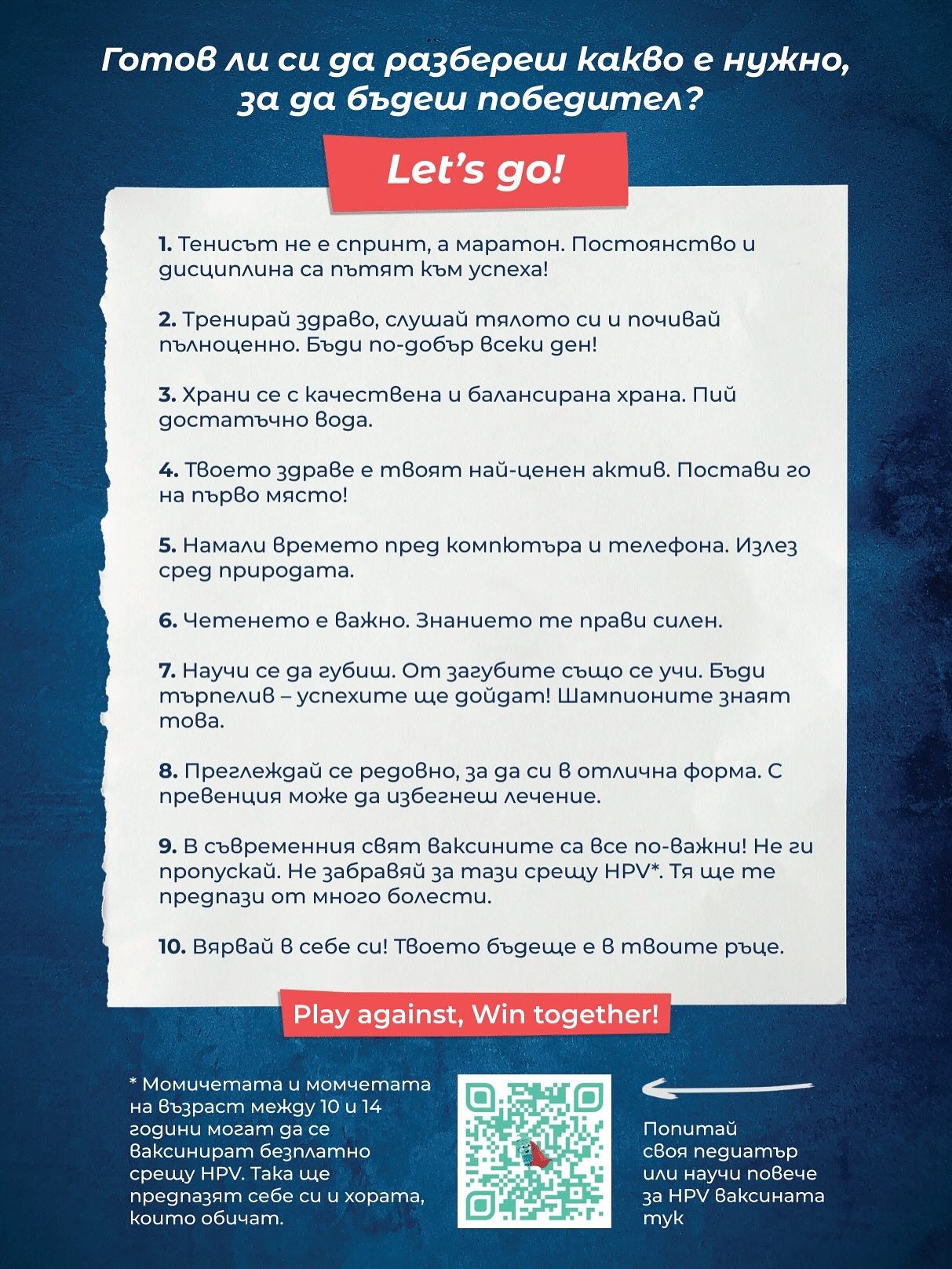 Готов ли си да разбереш какво е нужно, за да бъдеш победител? Фондацията е разработила специална образователна картичка с 10 съвета към децата.